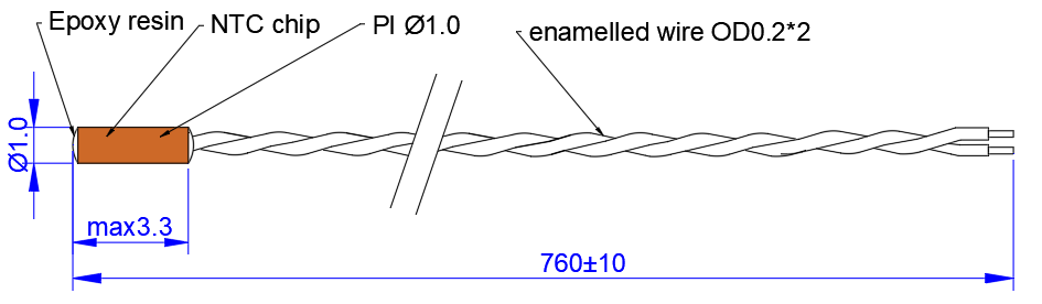 This product is a miniature medical temperature sensor NTC thermistor. Once the miniature chip is welded, it is encapsulated with a polyimide tube with an outer diameter of Maxφ1.0. The inside of the tube is filled with epoxy resin, and the lead is encapsulated by OD0.12*2. enamelled wire.