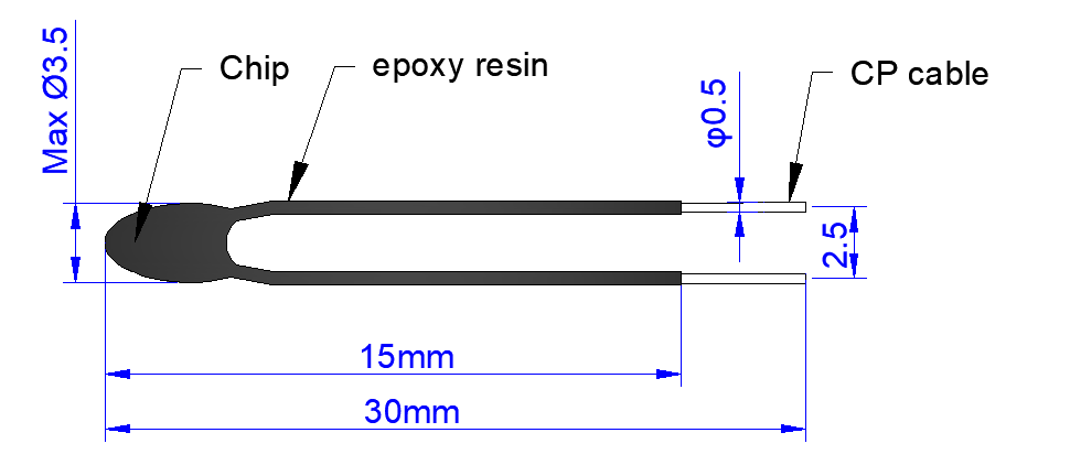 MF5A-3 series epoxy coated NTC Thermistor is manufactured from Hefei Jingpu Sensor Technology Co.,Ltd. Lead Wrapped Epoxy NTC Thermistor is composed of Copper clad steel lead wire, soldered NTC chip and epoxy resin. The sensor features: simple, functional, high accuracy. The optional resistance value range from 0.3kΩ to 2000kΩ, and beta value range from 2500K to 4500K. These epoxy coated NTC Thermistors are widely apply for home appliances, automotive, medical equipment, power tool etc.